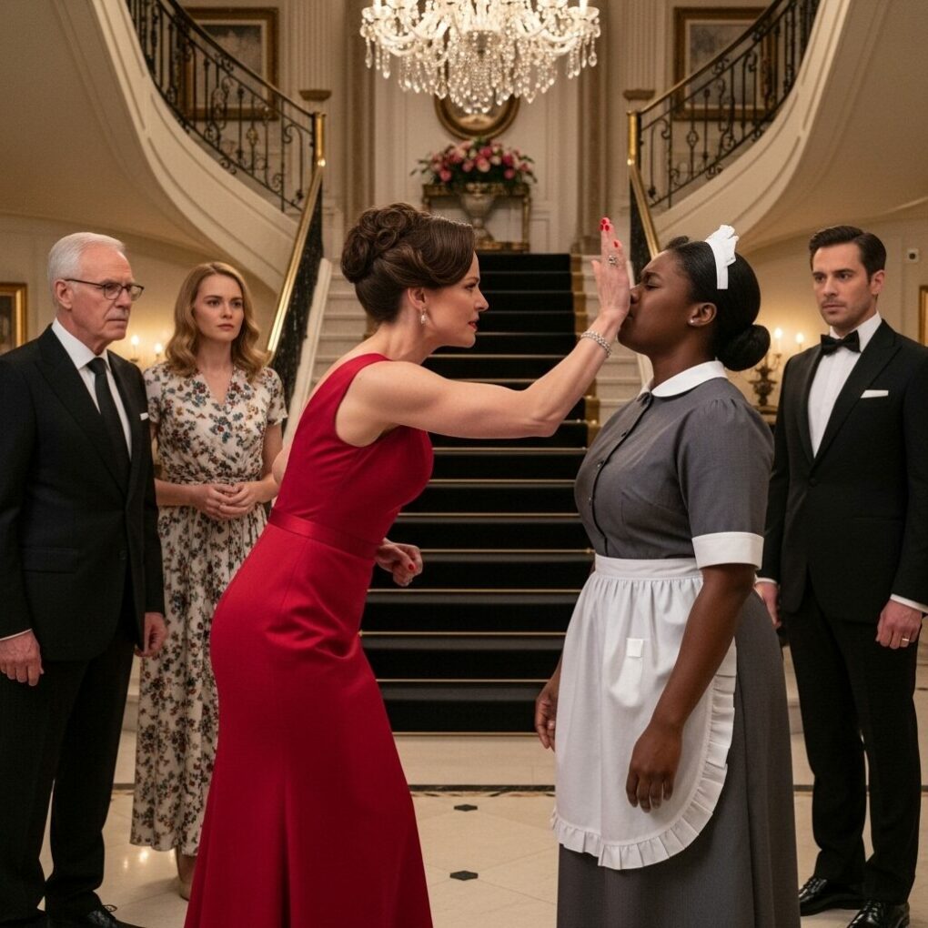The sound of a slap echoed through the grand hall like a gunshot. Naomi Hart, wearing the crisp gray uniform of a maid, staggered back, her cheek burning red. Across from her stood Isabella Moreau, the billionaire’s new wife, in a striking crimson gown, her hand still raised. Gasps filled the room as guests froze in disbelief.