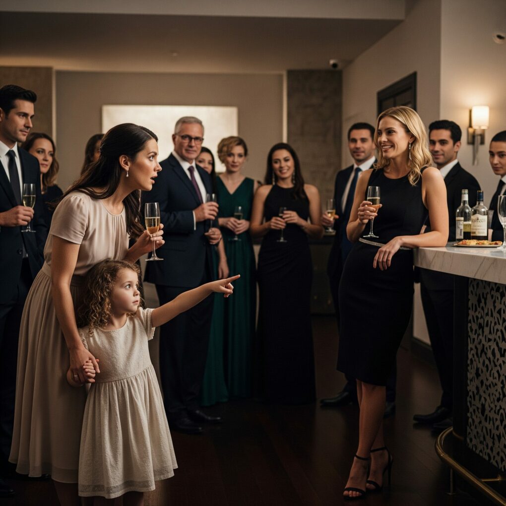 Theo, my husband of seven years, was across the room, basking in the glow of his promotion. The company had thrown this entire party to honor his partnership, and the room seemed to orbit around him. And yet, here was my daughter, pointing to another woman and speaking about secrets she should never know.