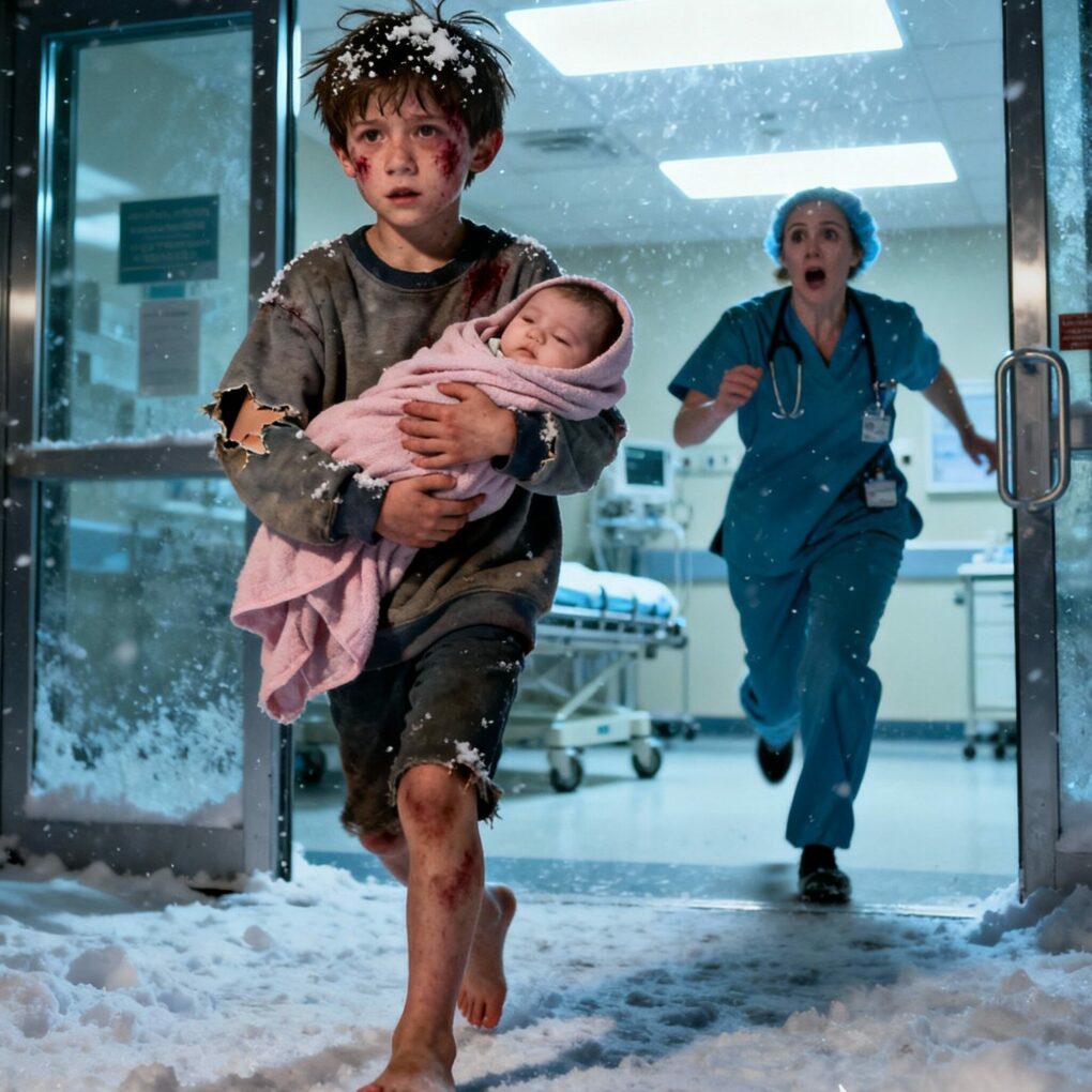 It was just past midnight when Ethan Walker, a bruised seven-year-old boy, stumbled into the emergency room of St. Mary’s Hospital in Indiana, carrying his baby sister wrapped in a thin pink blanket. The automatic doors slid open with a soft hiss, letting in the freezing winter air—and a silence that made every nurse look up.