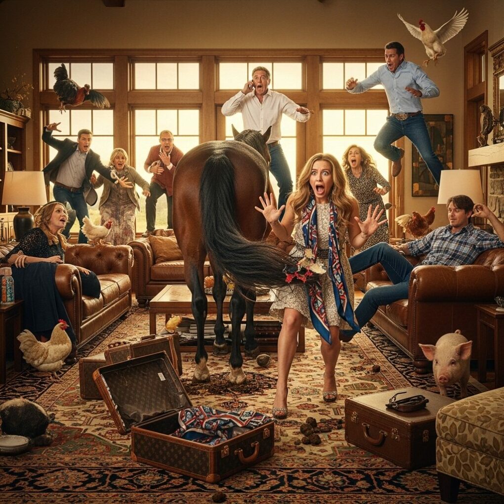 Through the feed, Gail saw Scout — her oldest stallion — standing proudly in the entryway, tail swishing like a flag. Behind him, Bella had wandered into the kitchen, chewing contentedly on Sabrina’s designer scarf. Thunder, always dramatic, knocked over a vase that had cost a fortune.