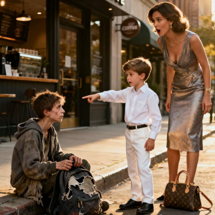 Across the street, near the corner of a bakery, sat a small boy huddled under a broken umbrella. His clothes were soaked, his hair tangled and matted. He was eating from a discarded sandwich wrapper. Despite the grime, there was something hauntingly familiar about him — the same deep brown eyes, the same dimpled chin, the same gentle curve of his mouth.