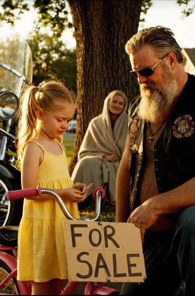 On the sidewalk stood a little girl, no more than six years old. Her name, they later learned, was Mira Langley. She wore a faded yellow dress and old sneakers. Next to her was a small pink bicycle, its white basket held together by tape. A torn piece of cardboard hung from the handlebars with shaky letters: