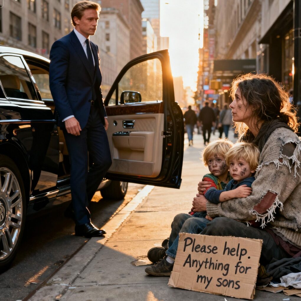 As he walked toward his office tower on Madison Avenue, something caught his eye — a shape huddled by the corner of the street. A woman sat on the cold sidewalk, clutching a piece of cardboard. Two little boys, about three years old, stood beside her, their blond hair messy, their small hands gripping her sleeves. The cardboard sign read: