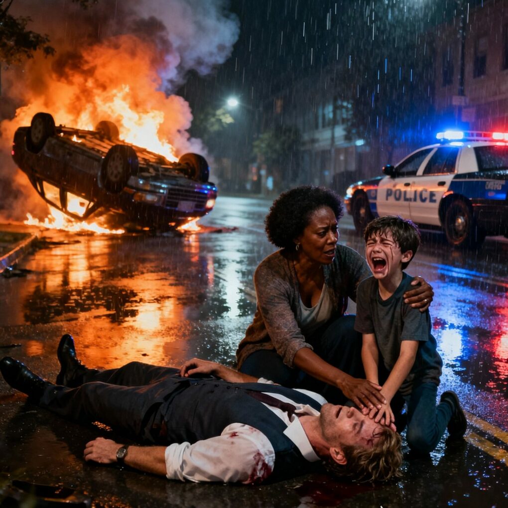 Naomi’s hands shook violently as she yanked the driver’s door open. The man inside—mid-40s, tailored shirt, wedding ring—had blood trickling down his forehead. His son in the back seat sobbed, clutching a worn stuffed lion.