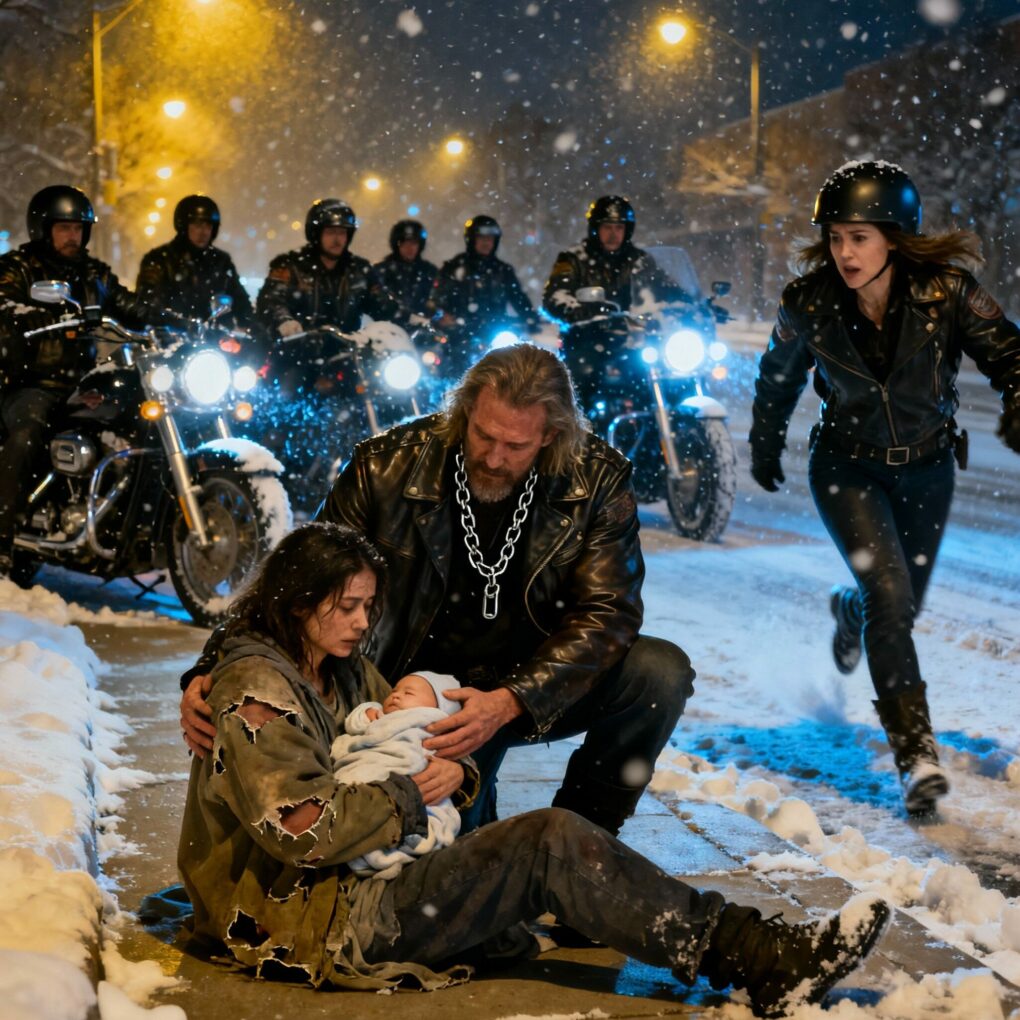 From the darkness beyond the street, the roar of engines interrupted the silence. Ten motorcycles appeared, headlights cutting through the blizzard. Vanessa’s eyes widened. Her lips barely moved. “Please… someone… help her…” she begged.