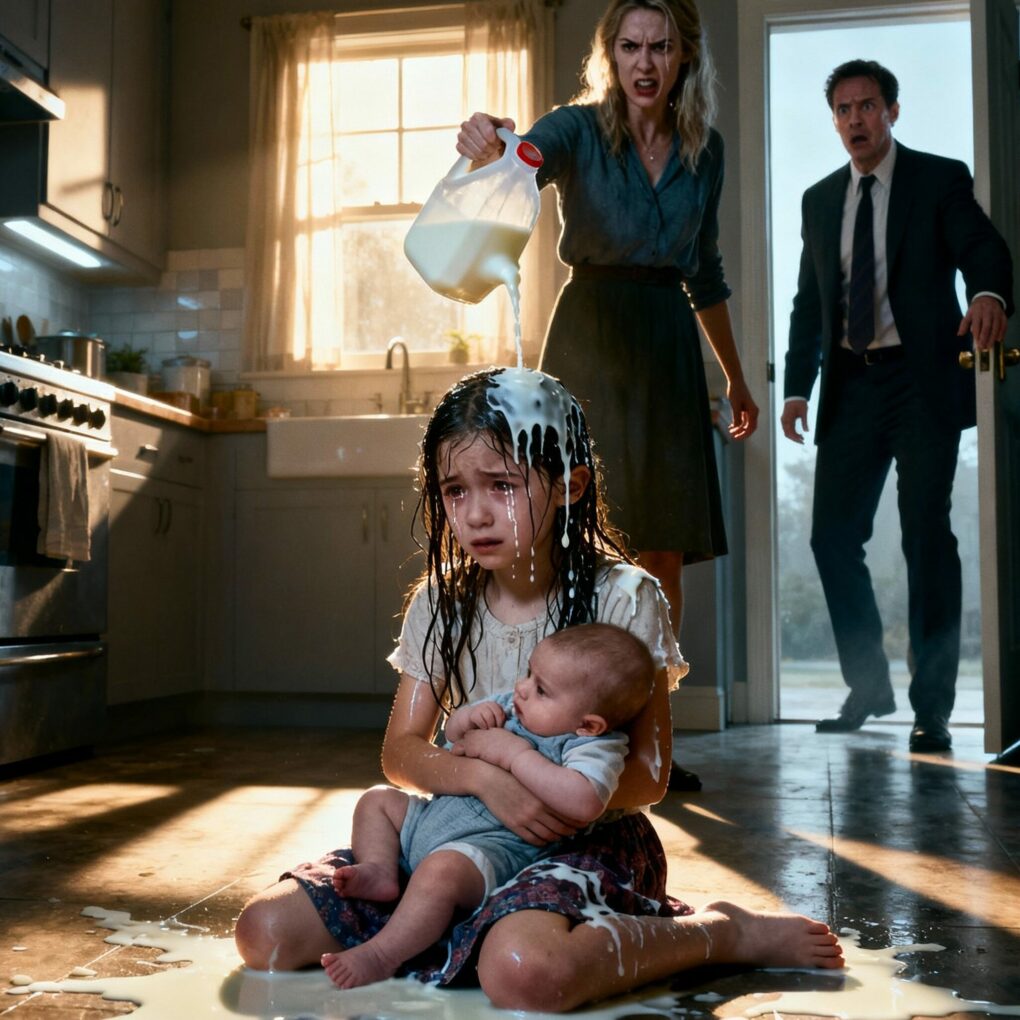 Emily was crouched on the tiled floor, milk dripping down her hair, her dress soaked, puddles spreading around her knees. She held Alex tightly against her chest, his small face buried into her shoulder. Standing above them, a shattered expression twisted into anger, was Vanessa—holding the empty milk jug like a weapon.