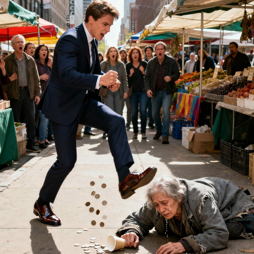When he walked by, the woman accidentally reached toward his leg, maybe mistaking him for someone offering help. Daniel’s pride flared. Without thinking, he jerked his leg away and kicked her hand aside, muttering, “Don’t touch me.” The motion was harsher than he intended, and the woman fell backward, her cup spilling coins across the pavement.