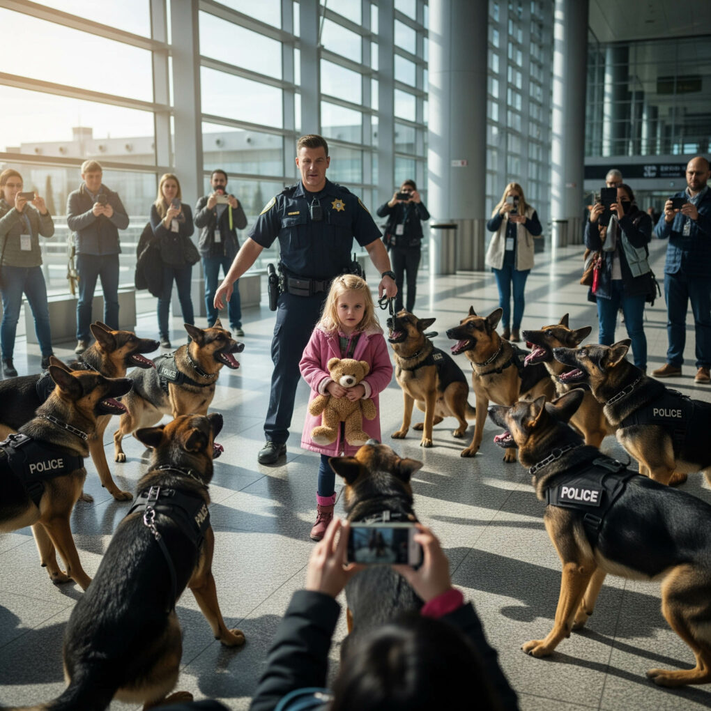 Everything was normal—until Rex, Mark’s German Shepherd and lead dog, suddenly froze. His ears twitched. A low growl rumbled in his throat. Within seconds, all fourteen dogs shifted formation, circling a small girl standing alone near Gate 12.