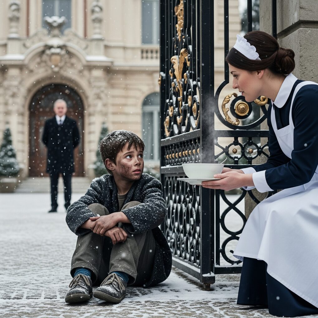 As she worked, she noticed movement near the wrought-iron gate. A boy—small, thin, barefoot—stood gripping the bars. His clothes were dirty, his face pale, his arms wrapped tightly around himself. He looked maybe six or seven. The kind of child who should have been in school, not shivering in the cold.