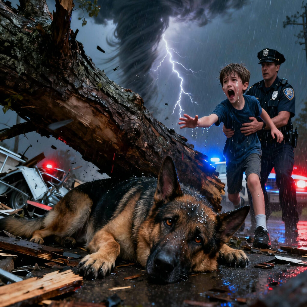 “Go, Max!” Mark yelled as debris rained down. Max herded Ethan toward the exit, guiding him through the rubble like a guardian. But before they could escape, the tornado’s gust ripped a tree from its roots, sending it crashing toward them.