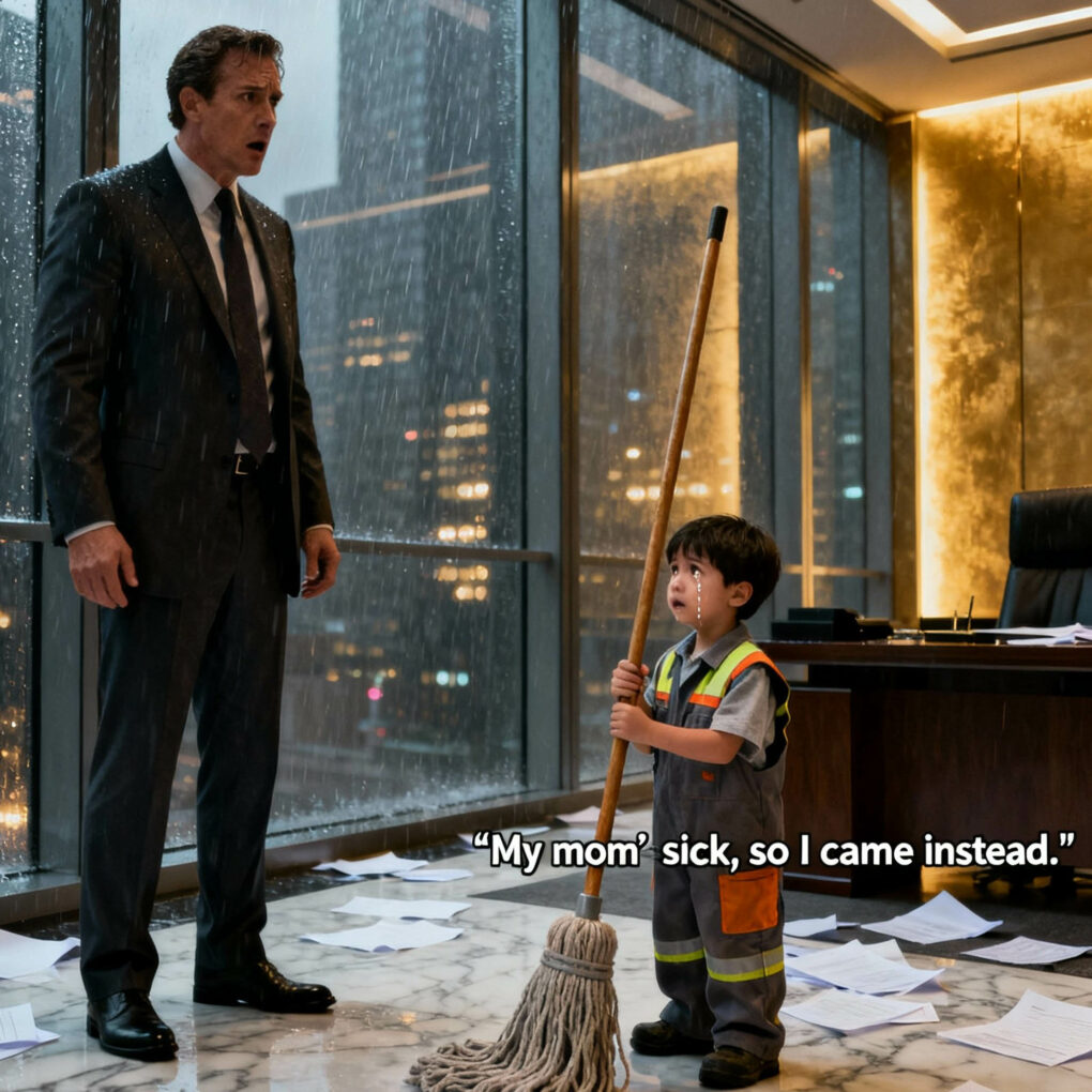 The boy looked up timidly. “Sir… my mommy’s sick. She cleans your office. I came instead.”