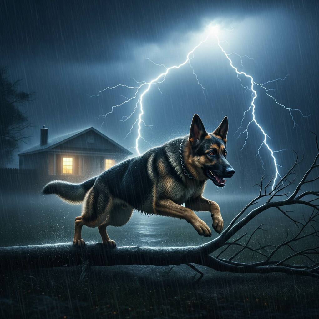 The dog barked wildly, circling him. The lights flickered and died. Rain crashed against the windows as thunder shook the walls. Shadow pawed at the door, whining, then began ramming it with his shoulder until it burst open.