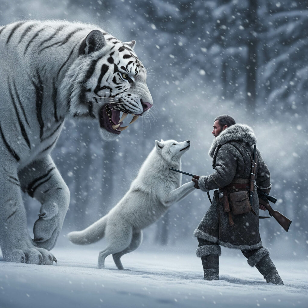 The tiger lunged first. Liam barely had time to raise his rifle before Nova leapt forward, slamming into the predator’s side. The air filled with snarls and the snapping of jaws. Snow turned crimson beneath their struggle. Liam fired a shot, the bullet grazing the tiger’s shoulder, but it only enraged the beast further.