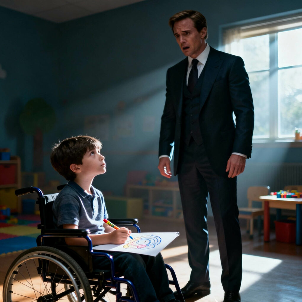 When Ethan entered the small therapy room, he found Noah sitting in a wheelchair by the window, sketching with broken crayons. The boy didn’t look up.