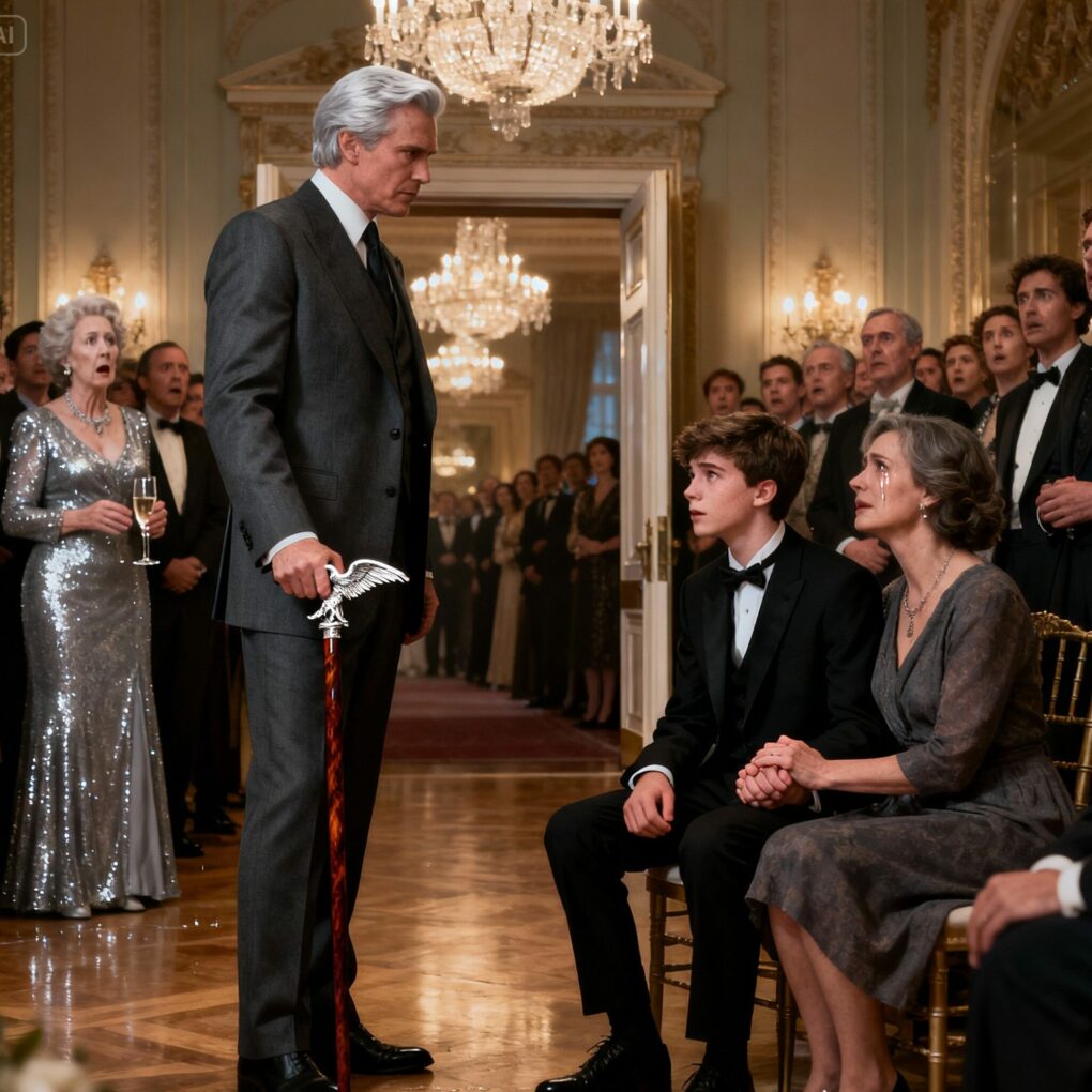 Before she could answer, the grand double doors of the ballroom swung open with a thunderous sound. Every conversation died. A tall man in a charcoal suit stood framed in the doorway — silver-haired, commanding, his cane gleaming under the chandelier’s light.
