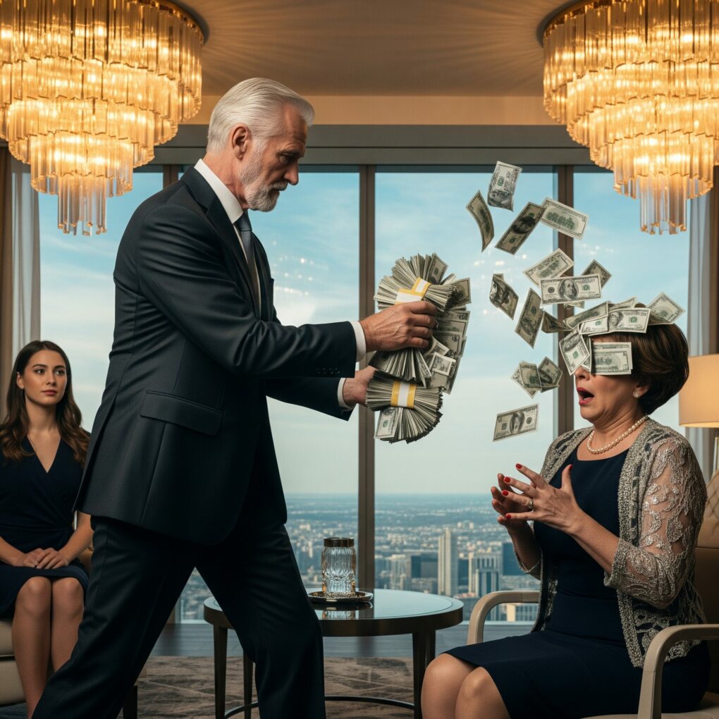 Richard stepped forward, picked up the stack of cash, and flung it back at her. The bills scattered across her lap like worthless confetti.