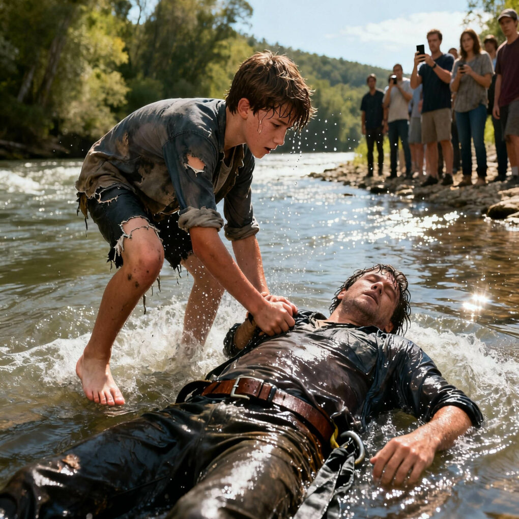 Without hesitation, Ethan dropped his makeshift bag of scraps and sprinted barefoot across jagged stones toward the riverbank. He ignored the burning ache in his feet and the sweat stinging his eyes. With a single leap, he plunged into the water. The cold shocked him, but he fought through it, swimming toward the struggling man. Ethan wrapped his arms around the man’s chest, gripping tightly, and kicked with all his strength, hauling him toward the shallows.