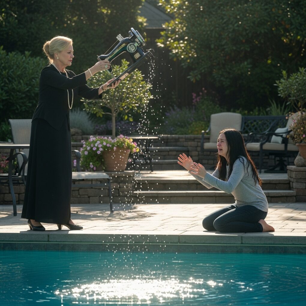 “It’s probably why you can’t finish simple chores,” Lori snapped, then shoved the machine into the pool. A heavy splash reverberated across the yard. Sofia screamed, reaching for the sinking machine, but it disappeared too quickly. Her father froze, silent, and Lori smirked.
