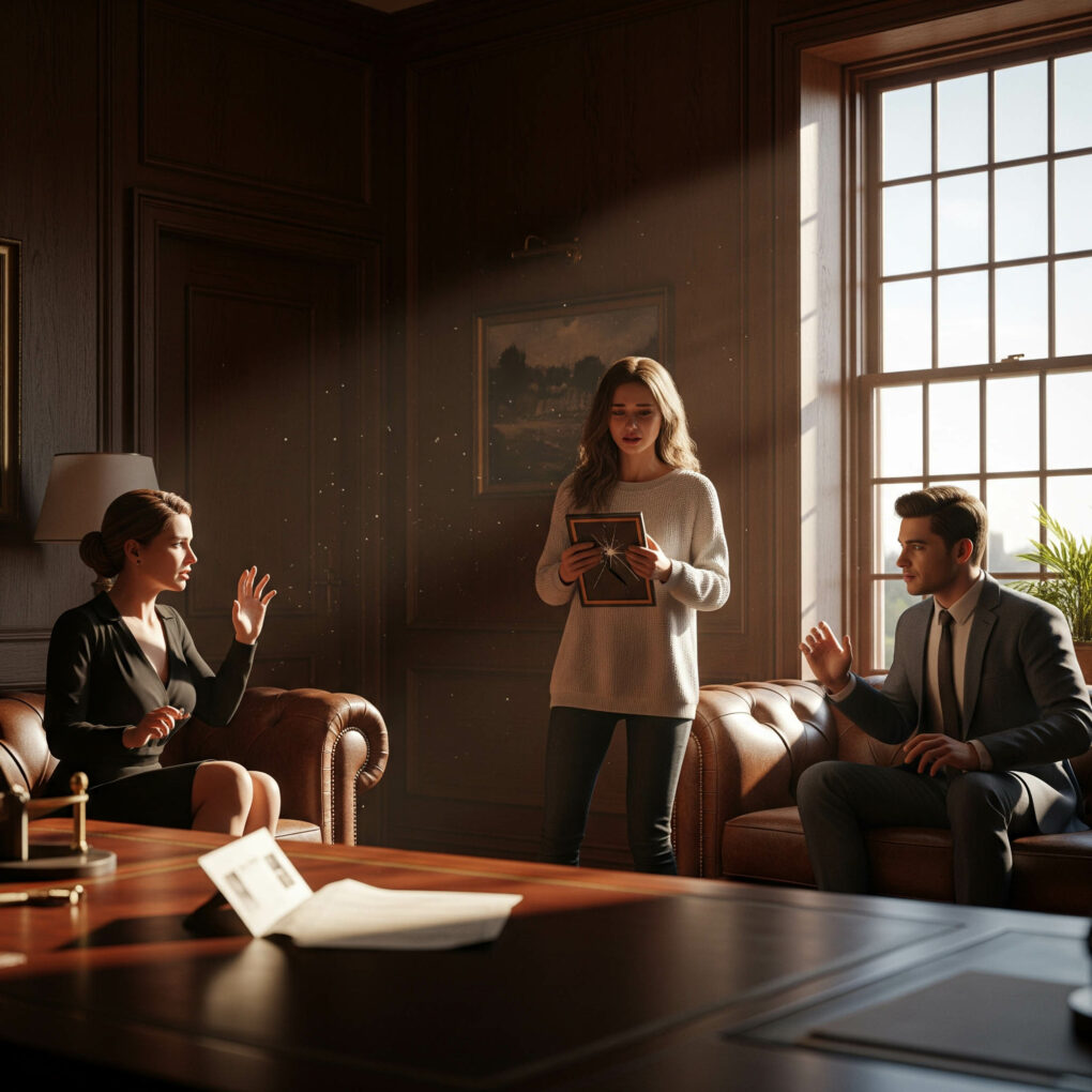She approached the desk and gently placed the cracked frame next to the codicil, a juxtaposition of deception and truth. Turning toward Victoria, she spoke clearly, measured: “You saw this frame as broken, worthless. But inside it held my father’s final message. You mistook cruelty for power. The truth is stronger than your lies.”