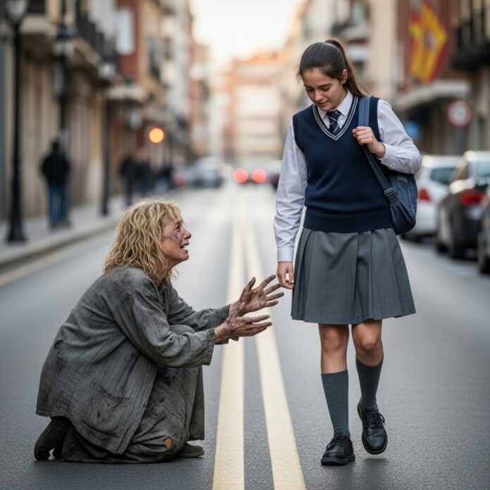 Cada tarde, al salir del Instituto Valle Verde, en un barrio tranquilo de Zaragoza, Clara Calderón, una chica de catorce años, caminaba junto a sus dos mejores amigos, Marta Ruiz y Javier López. Su ruta diaria siempre cruzaba la Plaza del Olivar, donde una mujer sin hogar ocupaba el mismo banco metálico, envuelta en capas de ropa usada. Su cabello castaño, enredado y húmedo por el frío de marzo, la hacía parecer mayor de lo que realmente era.
