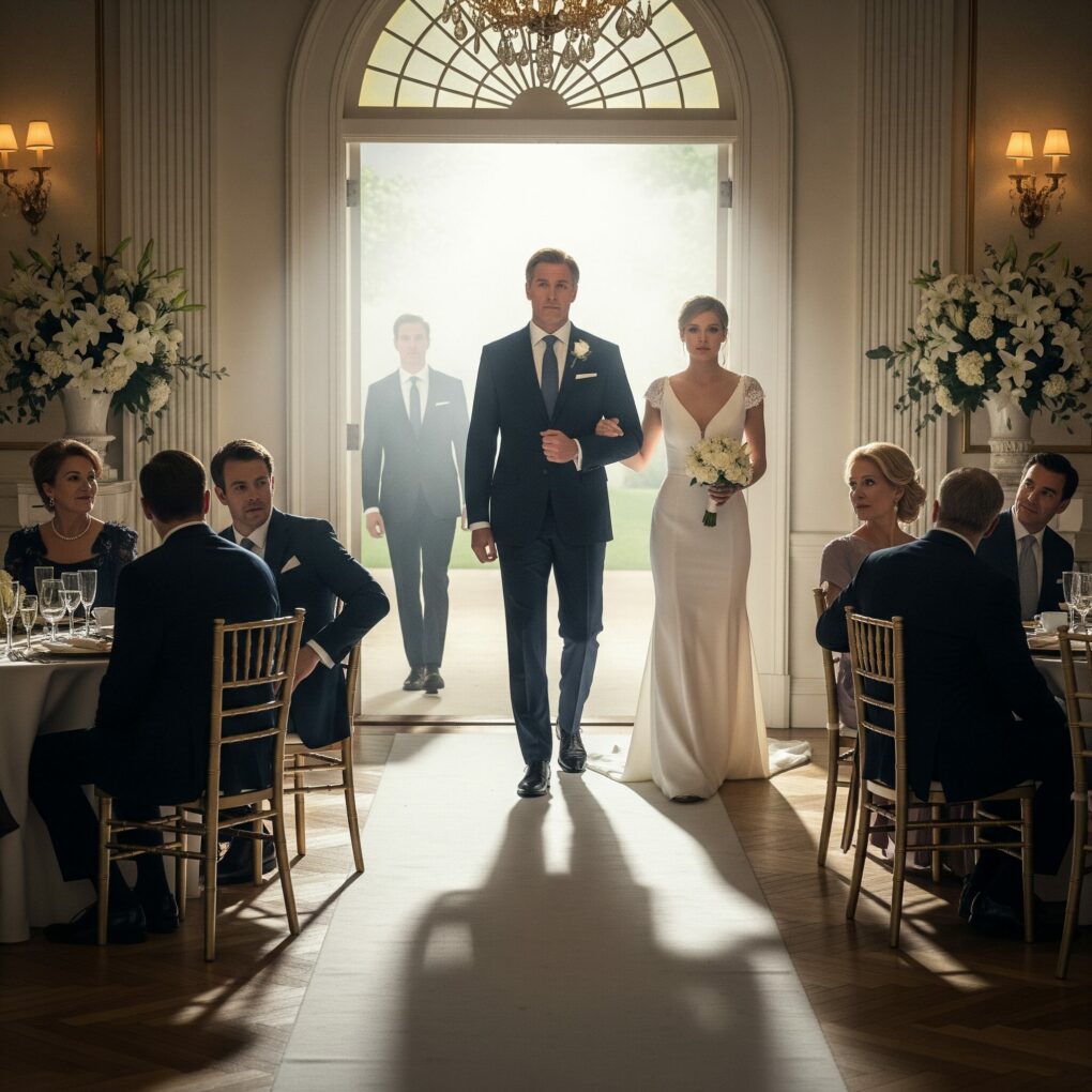 The double doors swung open with a force that made the floral arrangements tremble. Every mocking smile in the room vanished as the figure stepped through—a tall man in a tailored charcoal suit, flanked by two discreet security personnel.