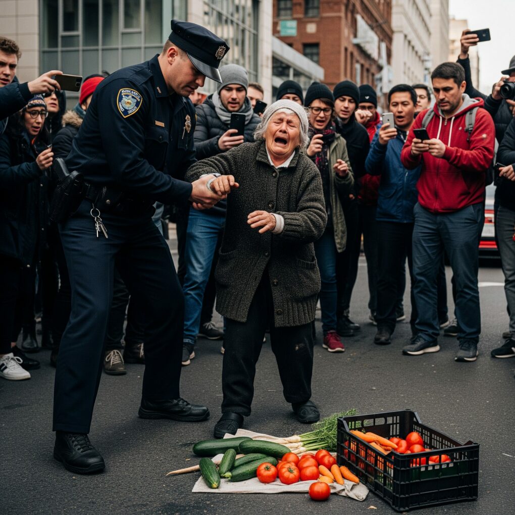 She stood beside a weathered wooden crate, her posture fragile yet stubbornly rooted to the ground. Her cardigan was faded, her skirt worn thin. Wisps of gray hair framed a lined face, and her hands—shaking slightly—rested near a small display of tomatoes, carrots, and cucumbers arranged with almost ceremonial care. It didn’t look like a business. It looked like desperation dressed up as dignity.