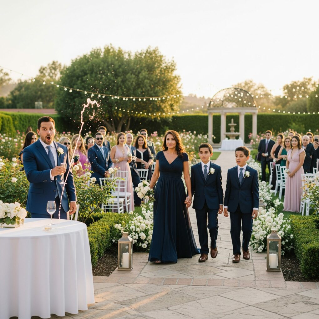 The Grand Belmont Hotel shimmered beneath the golden hour light as the town car pulled to a stop. Ramona stepped out first, her gown gliding like liquid silk across the pavement. Alden and Miles flanked her in matching tuxedos, standing tall and poised. The moment they entered the Rose Garden terrace, conversations stalled, champagne glasses paused mid-air, and heads turned toward the trio who commanded the space without asking for permission.