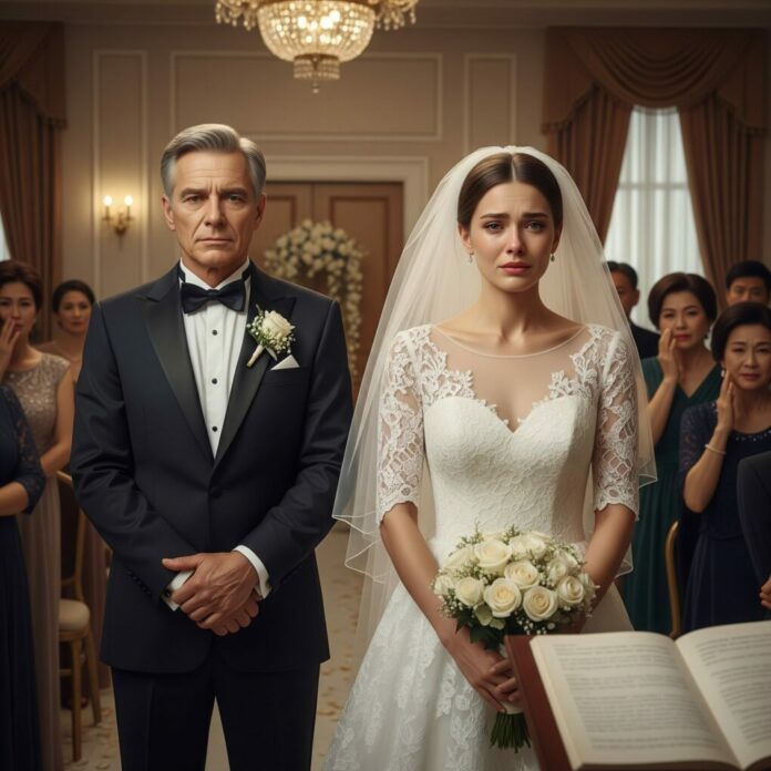 Samantha Jackson never imagined that at twenty-six she would walk down the aisle with tears running down her face—not from joy, but from resignation. The elegant hall, the murmuring guests, the scent of white roses… nothing matched the wedding she once pictured. Her hand trembled on her younger brother’s arm as she approached the man waiting for her at the altar: Richard Hale, a sixty-three-year-old widower, impeccably dressed, wealthy, calm, and utterly unlike the man she loved.