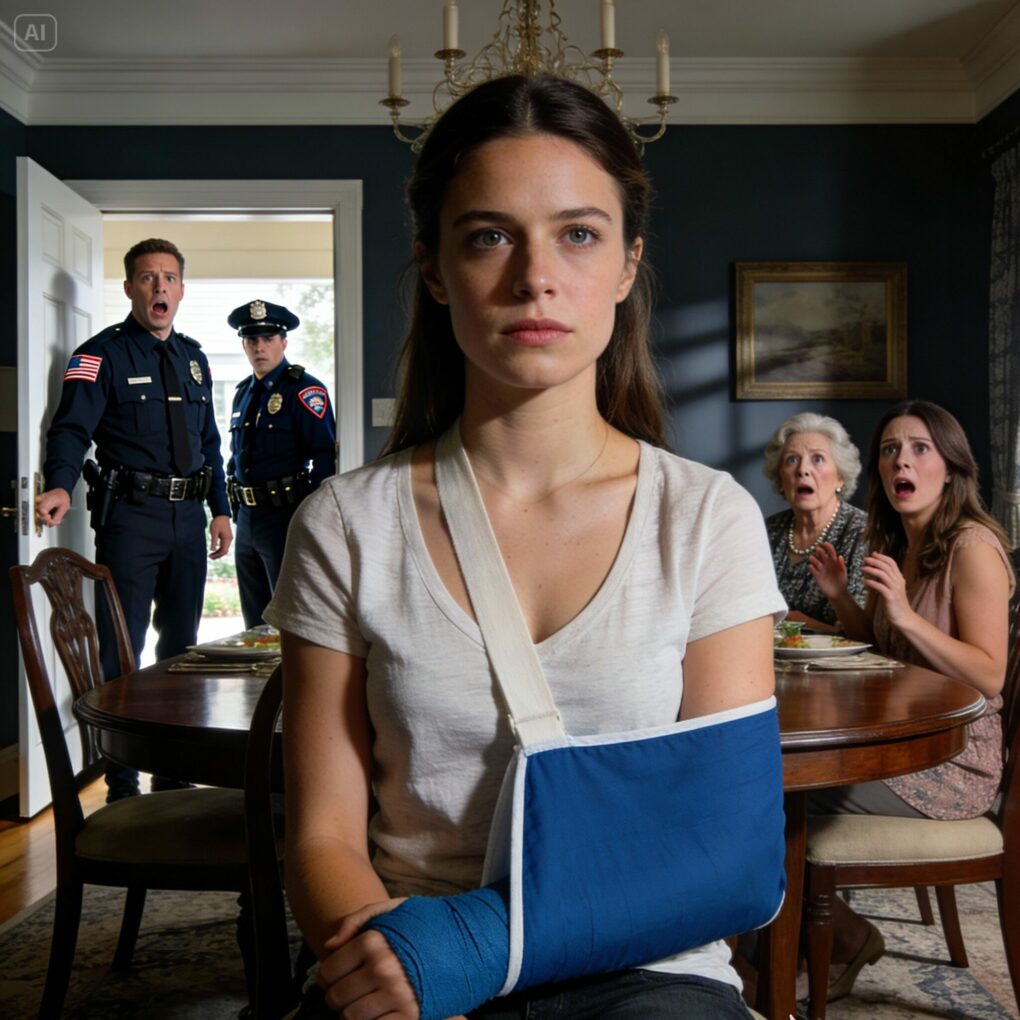 Aquella noche en la cena familiar todo olía a carne asada, vino barato y tensión contenida. Yo, Emily Carter, estaba sentada al extremo de la mesa, con el brazo derecho inmovilizado por un yeso que me llegaba desde la muñeca hasta casi el hombro. Apenas podía sostener el tenedor, y cada movimiento me recordaba el golpe que había recibido hacía dos días. No fue un accidente. Pero todos allí lo trataban como si lo fuera… excepto yo.