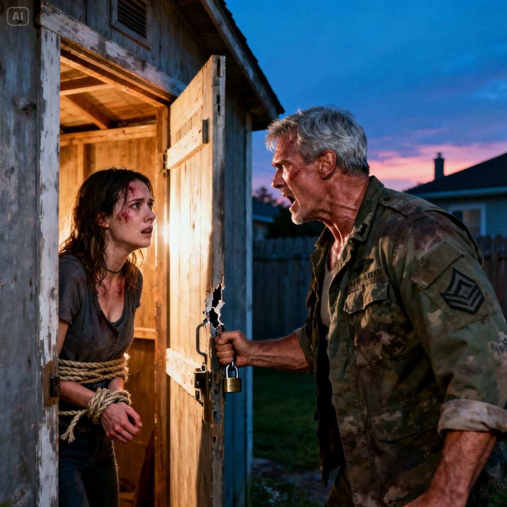 El olor a humedad y gasolina salió del cobertizo. Dentro, sentada en el suelo, con las muñecas atadas con una cuerda floja y el rostro pálido por el agotamiento, estaba Lucía. Cuando lo vio, sus ojos se llenaron de alivio inmediato.