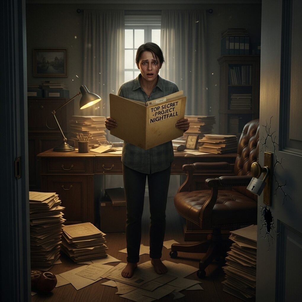 I spun around so fast the chair slammed into the desk. My heart pounded in my ears. “Who’s there?” I shouted into the hallway. No answer. I moved slowly toward the doorway, the folder still clutched in my hand. The house felt heavier than usual, like the walls were listening.