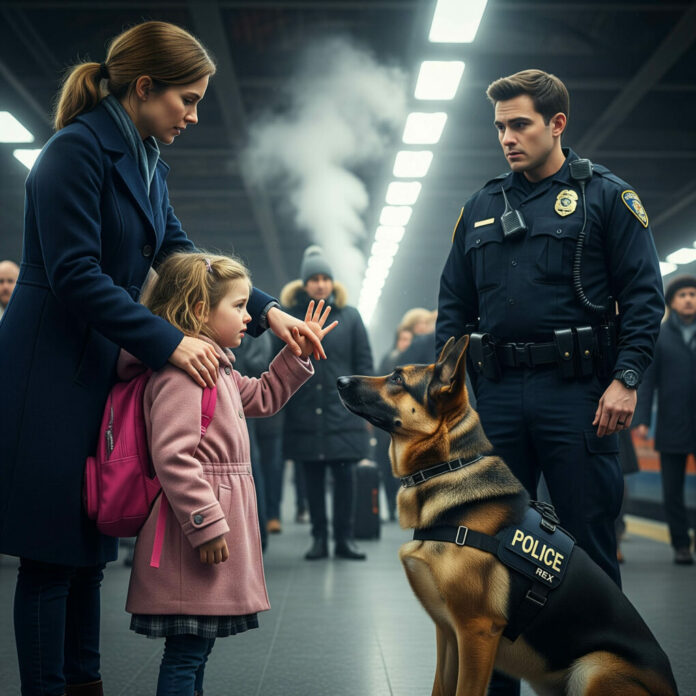 The dog’s gaze locked on a small figure near a vending machine — a little girl, no older than nine, clutching the hand of a tall woman in a dark blue coat. Something about them didn’t fit. The woman’s grip was too tight. The girl’s face — pale, frightened — met Rex’s eyes for half a second.