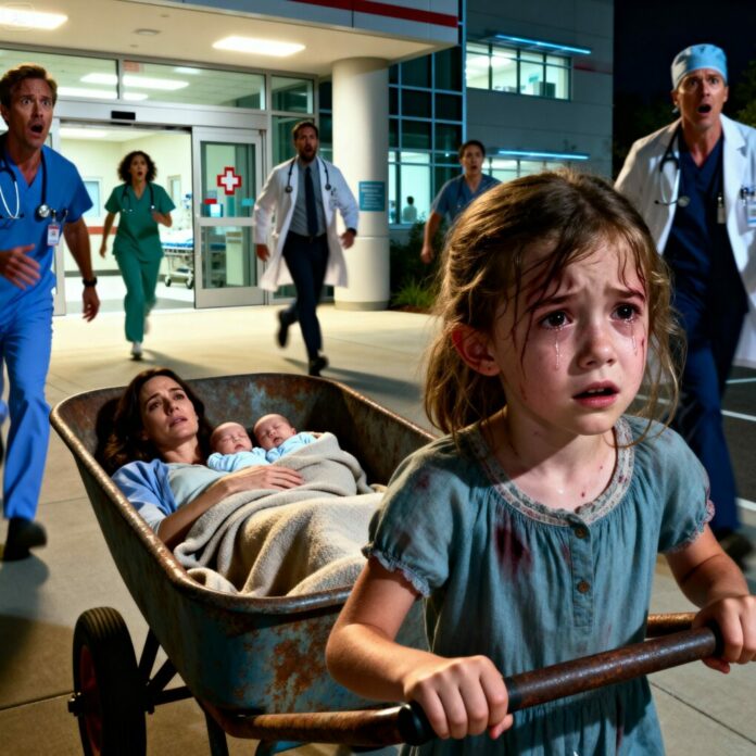 Después de más de ocho kilómetros, llegó al hospital comarcal. Sus piernas temblaban. Empujó la carretilla hasta la entrada de urgencias y gritó con todas sus fuerzas. Enfermeras y pacientes se quedaron paralizados al ver la escena: una niña exhausta, dos bebés morados por el frío, y lágrimas cayendo sin control.