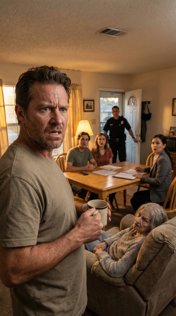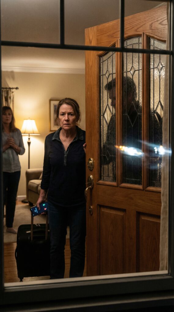 Denise stepped onto the small porch in a robe, arms folded tight. Her face wasn’t surprised either. It was controlled—like she’d rehearsed this.