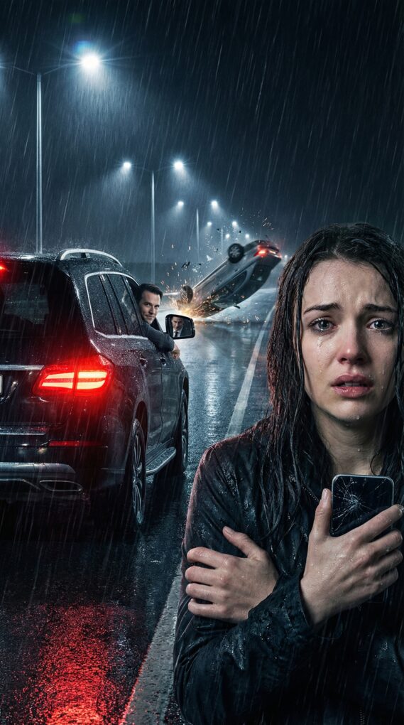 Thunder cracked like a warning. Headlights flared behind me—too fast, too close. A sedan fishtailed, tires shrieking. For a split second, the world went bright white with lightning and I saw the driver’s face—wide-eyed, panicked—fighting the wheel.