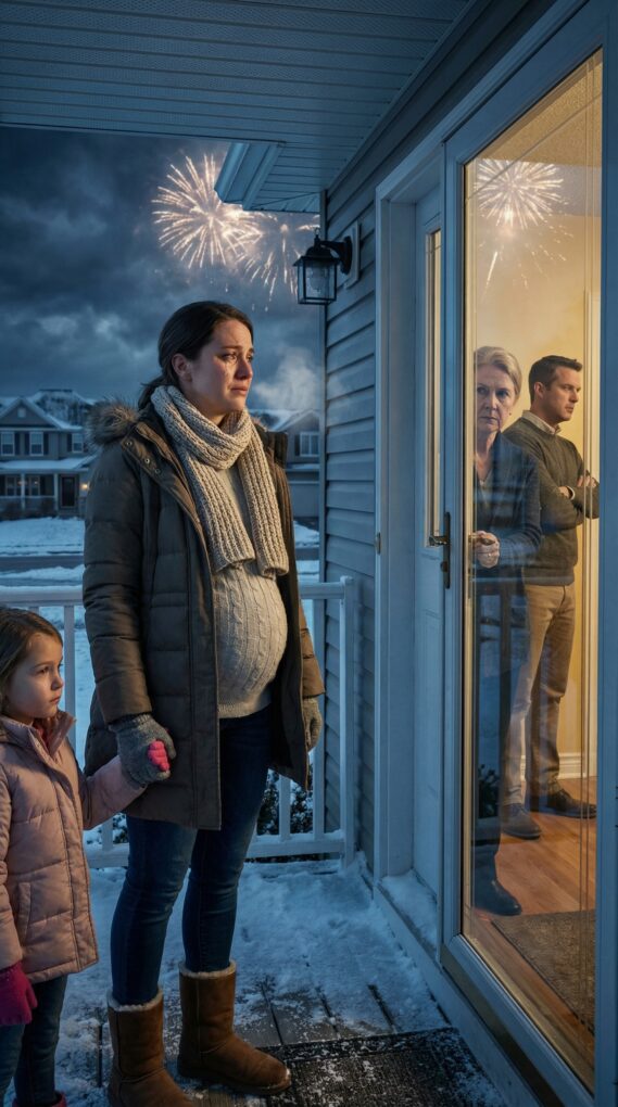 New Year’s Eve—before the first firework could bloom—the front door slammed in my face so hard the wreath shook. I stood on the porch with my eight-year-old daughter, Lily, clinging to my coat, and my belly tight with eight months of pregnancy. Cold air burned my lungs. Behind the glass, the living room glowed with party lights and the smell of ham and cinnamon candles—my life, sealed off in one violent sound.