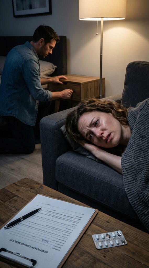 He stood and carried the folder toward the bedroom. The blister pack disappeared into his pocket. As he walked away, I caught the edge of the paper again—his name written in the beneficiary line in unmistakable block letters.