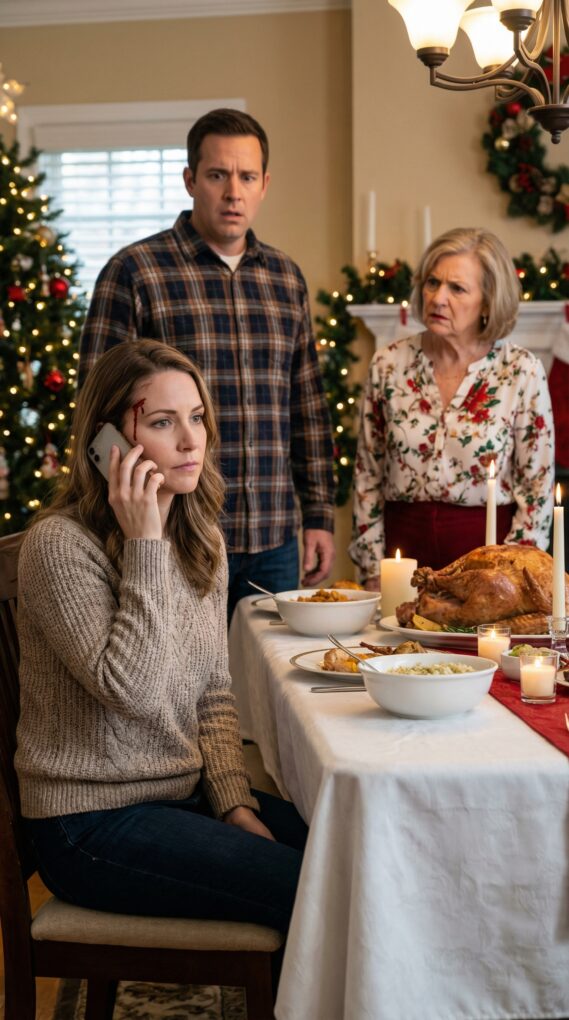 Christmas was supposed to feel warm—until my “mama’s boy” husband hissed, “Don’t you get it? Mom doesn’t want to eat with you.” I’d been in the kitchen since dawn, hands raw, apron stained. His mother looked me up and down and sneered, “You look filthy. I can’t enjoy my meal if I have to look at your face.” I changed. I sat again. Then—a hard shove. My head slammed, and blood slid down my temple. They didn’t even flinch. So I smiled, lifted my phone, and whispered, “Police? I’d like to report a crime—illegal trespassing and assault.” Because the biggest shock? That house they think she “saved”? It was mine. And tonight… they’re about to learn who really owns it.