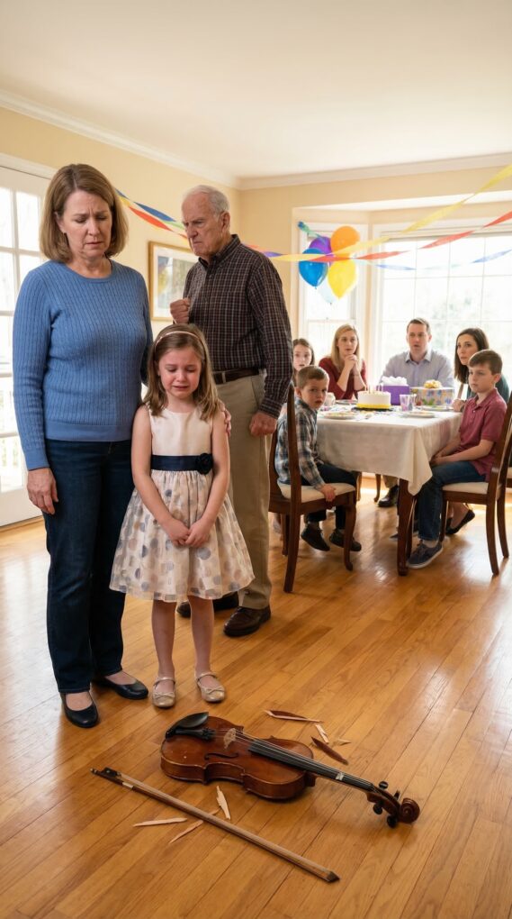On my daughter’s tenth birthday, I finally gave her the gift she’d been begging for – a violin. Her eyes lit up. “Mommy, look! Grandpa, look!” she exclaimed, running to show my father. He didn’t smile. “A violin? Do you want the whole family screaming all day?” Before I could answer, he snatched it – and threw it to the floor. It shattered with a loud crash. My daughter stood there speechless. I stared at the broken pieces of wood… and realized something else had just shattered too. But what do you do when your own father is the one who broke it?