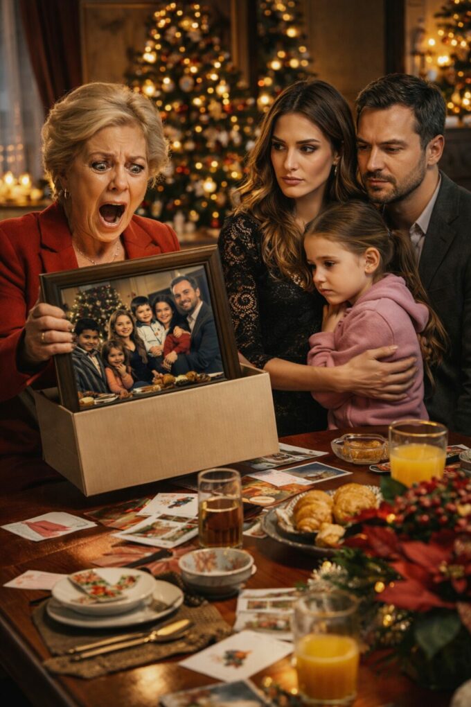 En la foto familiar, mi hija de siete años estaba en primera fila, sonriendo con una inocencia que partía el alma. Luego llegaron las tarjetas de Navidad, y en todas ella había desaparecido. “Mamá, ¿qué hice mal?”, lloró, y esa pregunta me destrozó por dentro. No levanté la voz, no peleé con nadie; decidí responder de otra manera. Pero cuando a la mañana siguiente mi madre abrió mi regalo y gritó horrorizada, comprendí que acababa de empezar algo imposible de detener.