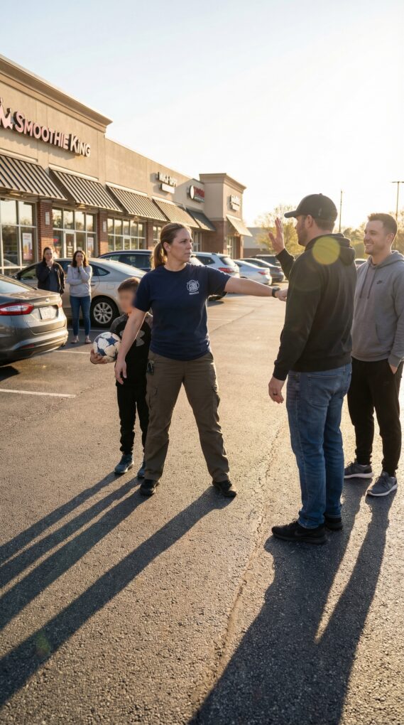 Emily Carter stepped out of the dry cleaners with a garment bag over one shoulder and her son Jacob’s hoodie in her hand. She wore simple cargo pants, a faded navy t-shirt, and sunglasses that reflected the warm orange light of the setting sun.