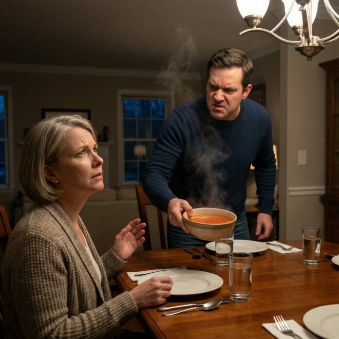 Daniel tomó su plato, se levantó ligeramente y me volcó la sopa caliente sobre la cabeza. Sentí el ardor en el cuero cabelludo, el líquido resbalando por mi cara y cuello. La mesa quedó en silencio por un segundo… y luego él se rió. Una risa fuerte, cruel. Laura no dijo nada. Nadie se levantó.